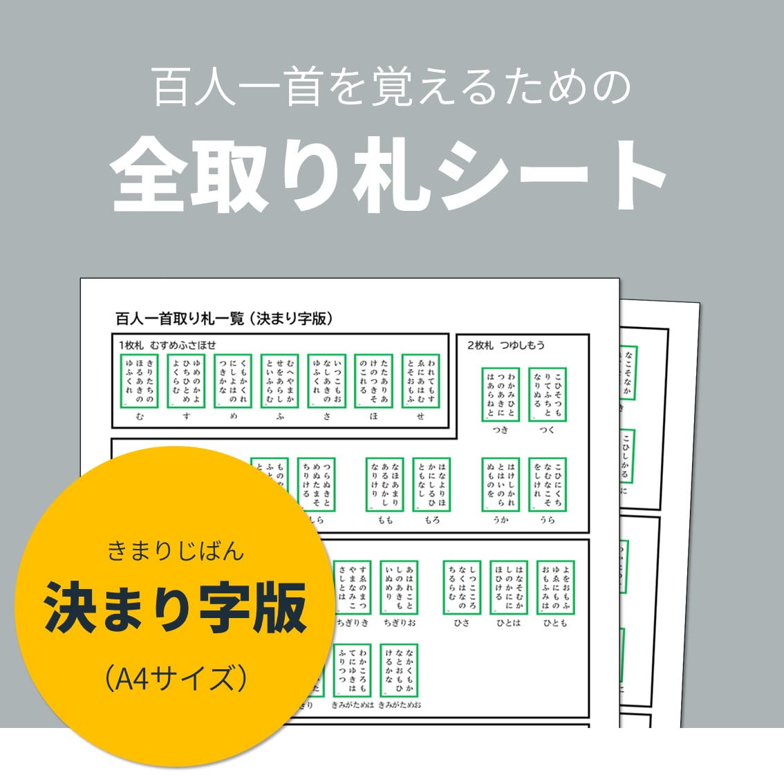 百人一首を覚えるための全取り札シートです。
